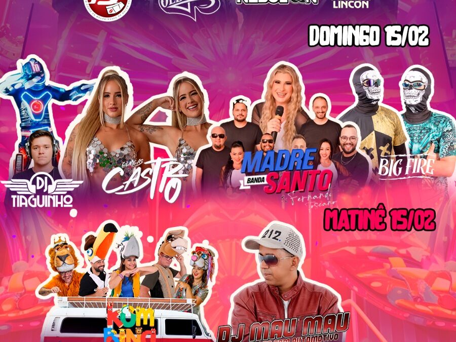 DOMINGO (15/02) – DJ Tiaguinho, Gêmeas Castros, Big Fire e Banda Madre Santo